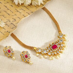 18K Gold-Plated RubyPink & White Kundan Stone Choker Set with Gold Beaded Detailing – Pink