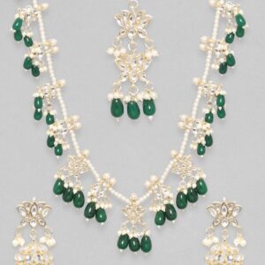 22K Gold Plated White & Green Kundan Studded & Beaded Multilayered Jewellery Set – Dark Green