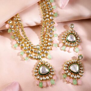 Gold Plated Kundan Studded Green & Pink Beads Layered Necklace Set – Gold