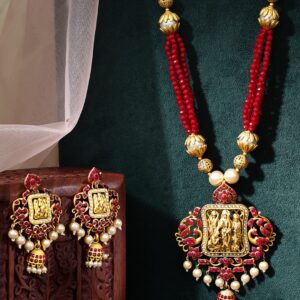 18K Gold-Plated Red & White Stones Pearl Beads Multi-Starnd Temple Jewellery Set – Gold