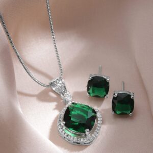 Rhodium-Plated Emerald & CZ Studded Pendant Necklace Set – Green