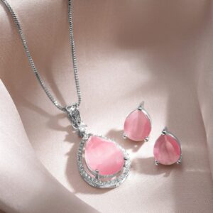 Rhodium-Plated Necklace Set with Pastel Pink Stone and CZ Accents – Pink