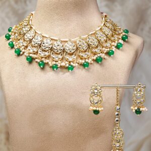 18K Gold-Plated Kundan-Studded White & Green Beaded Choker Necklace Set with Earrings & Maang Tikka