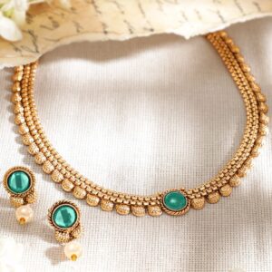 22K Gold-Plated Handcrafted Choker Necklace Set with Emerald Green Cubic Zirconia & Off-White Beads