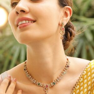 Rhodium-Plated Cubic Zirconia Studded Necklace Set with Multi-Color Gemstones – Silver