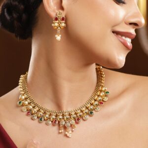 22K Gold-Plated Glossy Pearl Beaded Kundan Handcrafted Choker Necklace Set