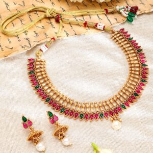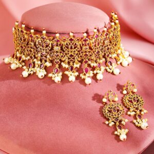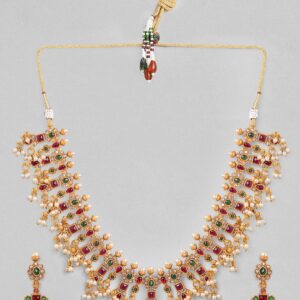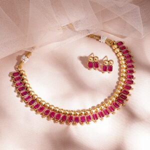 24K Gold-Plated Ruby Studded & Pearl Beaded Handcrafted Choker Necklace Set – Gold