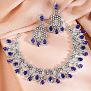 Rhodium Plated Blue Sapphire & White Cubic Zirconia Studded Teardrop Design Premium Jewellery Set – Blue
