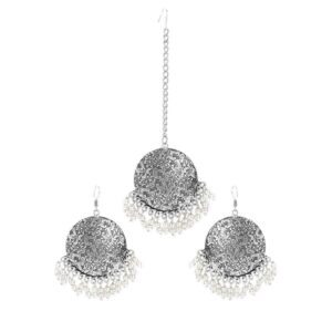 Oxidized Silver-Plated Maang Tikka and Earrings Set with White Beads Detailing – Silver