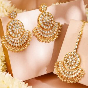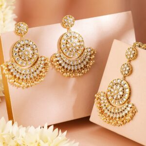 24K Gold Plated Kundan Stone Earrings & maang Tika Set – Gold