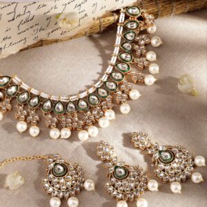 22K Gold Plated Kundan Studded & Pearl Beaded with Green Enamel Border Jewellery Set – Gold