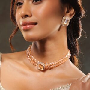 22K Gold-Plated Pastel Pink Sapphire Studded Choker Necklace Set with Gold Beads – Pink