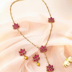 22K Gold Plated Ruby Pink Studded Layered Lotus Motif Necklace Set
