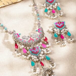 Oxidized Silver-Plated Multicolor Enamel & Pearl Beaded Dangling Necklace Set