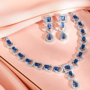 Rhodium-Plated Blue Sapphire AD & Cubic Zirconia Studded Necklace Set – Blue