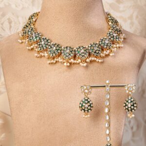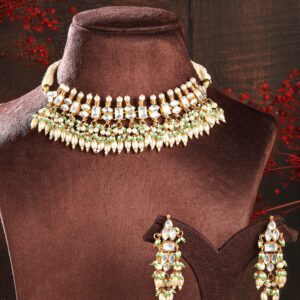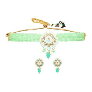 22K Gold-Plated Mint Green Beaded Choker Jewellery Set with Intricate Kundan Work – Gold