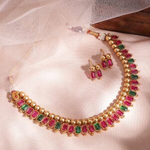 22K Gold-Plated Ruby & Emerald Stone Handcrafted Necklace Set with Golden Beads