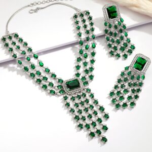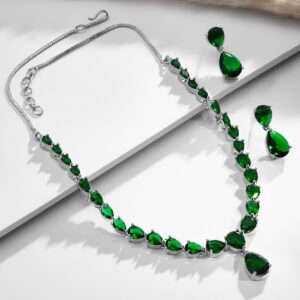 Rhodium-Plated Emerald Green & White Cubic Zirconia Studded Chandelier Necklace Set – Green