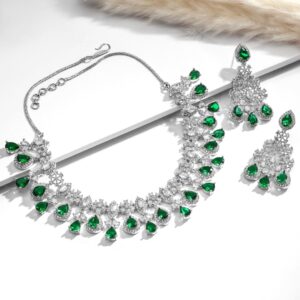 Silver-Plated Emerald Green & Cubic Zirconia Studded Luxurious Statement Multilayer Jewellery Set – Silvevr
