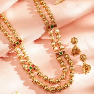 18K Gold-Plated Ruby & Emerald Studded Temple Motif Gold Beaded Necklace Set for Women