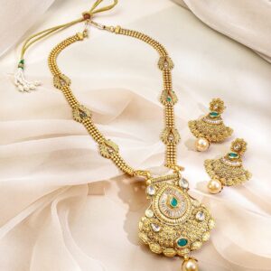 22K Gold-Plated Emerald Green Stone Studded Traditional Temple Long Necklace Set for Women – Green