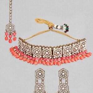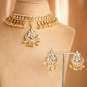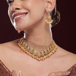 22K Gold-Plated Kundan & Pearl Beaded Handcrafted Choker Jewellery Set – Gold