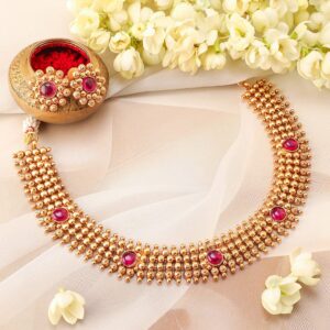 22K Gold-Plated Ruby Pink Studded Traditional Choker Necklace Set with Gold Beads