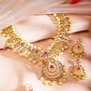 22K Gold-Plated Ruby Pink, Emerald Green, Kundan & Pearl Bead Accents Necklace Set