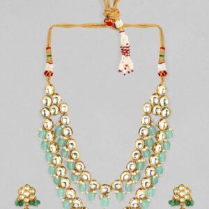24K Gold-Plated Pachi Kundan Studded Necklace & Earrings Set with Pearl & Green Bead Details