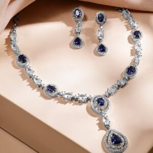 Rhodium Plated Blue Sapphire & White Cubic Zirconia Studded Teardrop Design Premium Jewellery Set – Blue