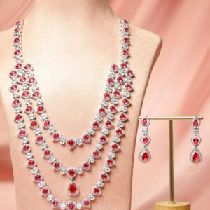 Rhodium-Plated Multi-Layer Ruby Red & Cubic Zirconia Studded Luxe Statement Necklace Set