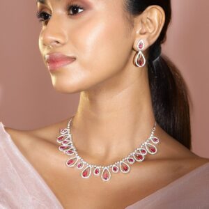 Rhodium Plated Ruby & Cubic Zicronia Studded Premium Drop Jewellery Set – Silver