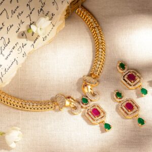 22K Gold-Plated Ruby Pink & Emerald Cubic Zirconia Studded Handcrafted Necklace Set – Green & pink