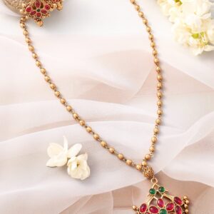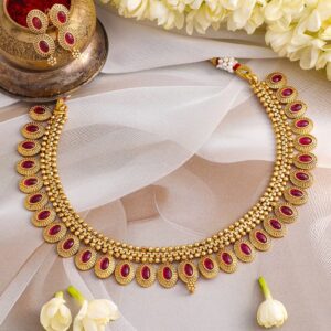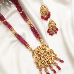 22K Gold plated Striking Ruby Red Beaded handcrafted Temple Necklace Set – Gold::Red