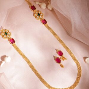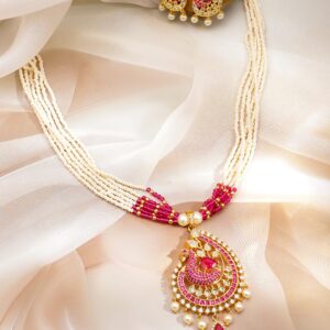 22KT Gold Plated Ruby Stone Studded Beaded Necklace And Earrings – Pink