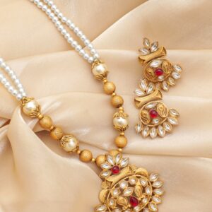 18K Gold-Plated White Pearl Beaded & Kundan Studded Pendant Necklace Set