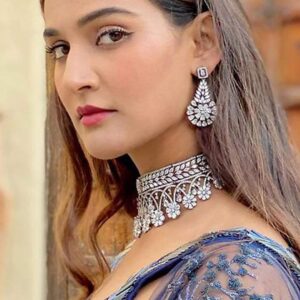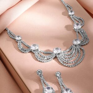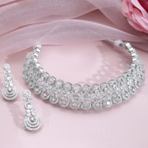 Luxury Rhodium Plated Zirconia Studded Statement Choker Necklace Set – Silver
