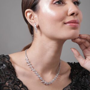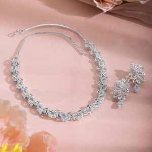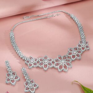 Rhodium Plated AD & Cubic Zirconia Studded Luxurious Floral Motif Necklace Set – Silver