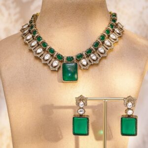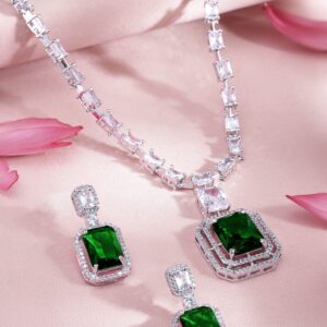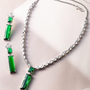 Rhodium-Plated Emerald Green & Cubic Zirconia Studded Luxury Statement Necklace Set – Green