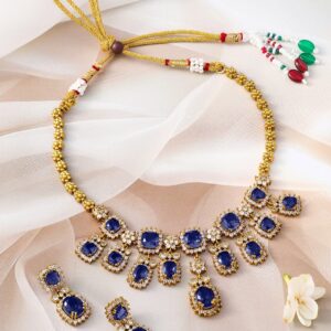 22K Gold-Plated Blue Sapphire Stone & Sparkling Cubic Zirconia Studded Necklace Set