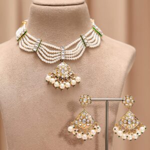 18K Gold-Plated White Kundan Choker Necklace Set With White Beads And Pearls – Gold