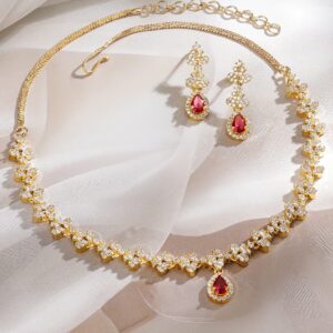 22K Gold-Plated Ruby Pink & White Cubic Zirconia Studded Necklace Set with Earrings