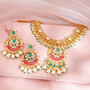 22K Gold-Plated Multicolor Kundan & Pink, Green Pearls Beads Studded Pearl Necklace Set for Women – Pink