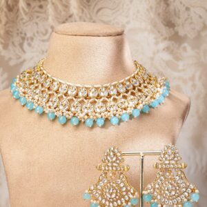 22K Gold-Plated White Kundan Studded & White Pearls & Blue Bead Drops Handcrafted Bridal Necklace Set – Blue