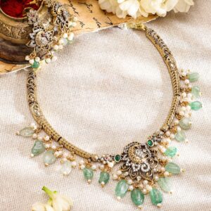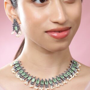 Oxidized Silver-Plated Mint Green Stone Studded Pearl Beaded Necklace Set – Mint Green