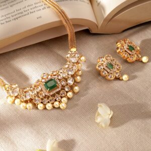 22K Gold-Plated Emerald Green Studded Traditional Choker Necklace Set with Gold Beads