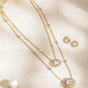 Premium 22K Gold Plated Polki and CZ Studded Double Layered Trendy Necklace Set with Earrings – Gold