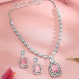 Rhodium-Plated Pastel Pink AD & Cubic Zirconia Studded Necklace Set – Pastel Pink
