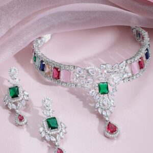 Rhodium-Plated Multicolor Gemstone & Cubic Zirconia Studded Choker Necklace Set – Silver