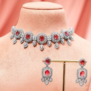 Rhodium-Plated Ruby & AAA Cubic Zirconia Studded Premium Choker Jewellery Set